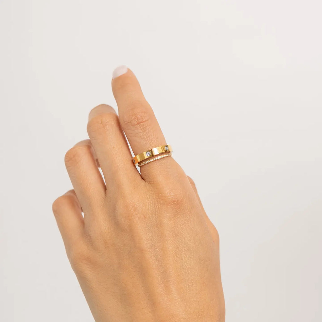 Add some bling to your fingers with our diamond ring band. Subtle yet stunning, it's perfect for stacking or wearing solo. Made from stainless steel with a robust layer of 18K gold, waterproof and made to live in, featuring stones that look like real diamonds.