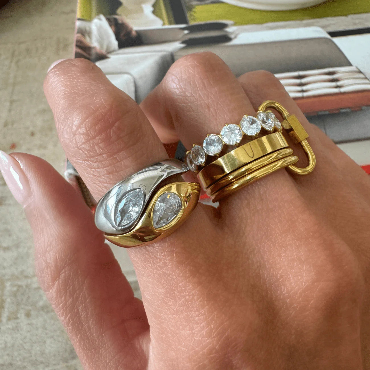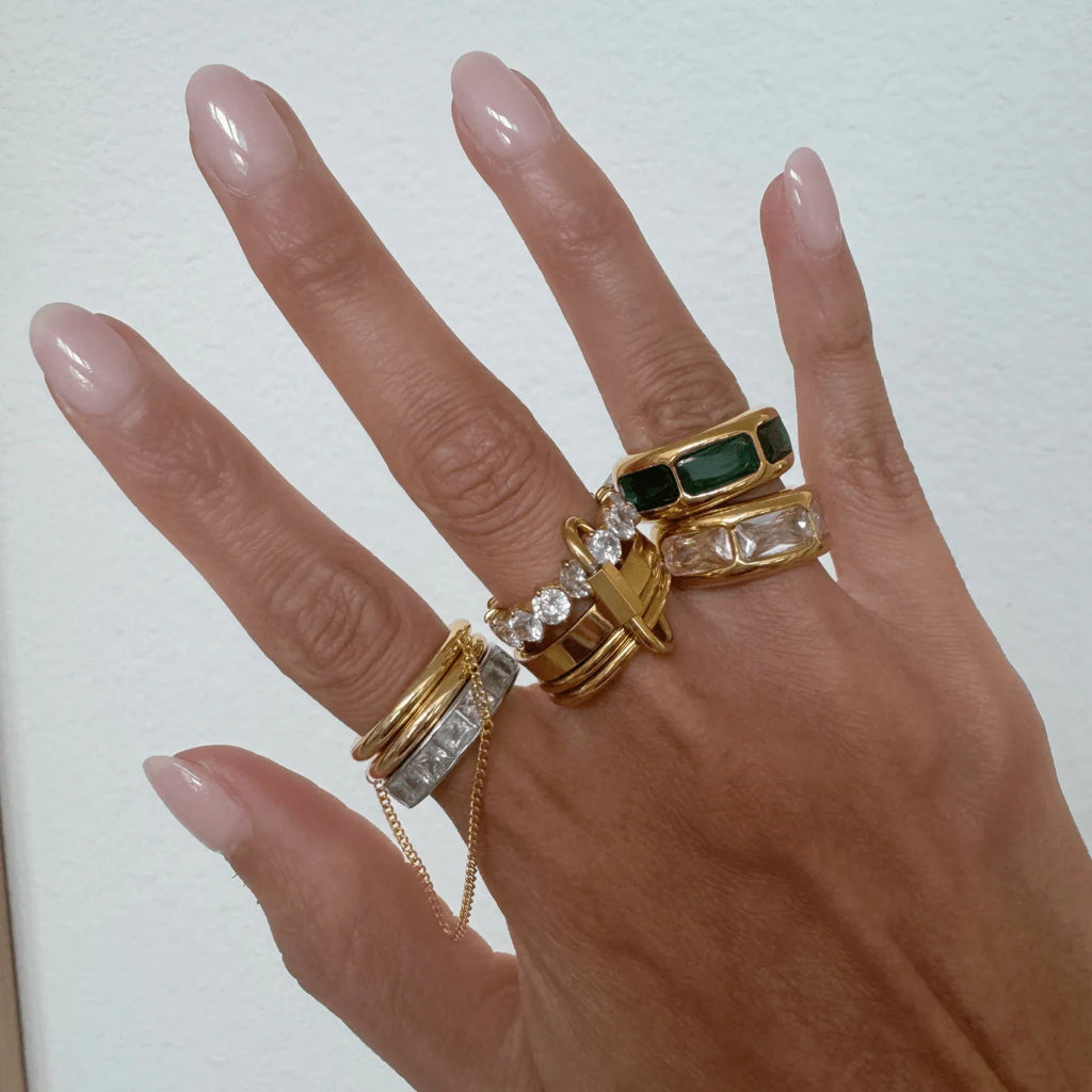The Reggie Stacked Ring is enhanced with bold cubic zirconia accents and thicker bands for a stronger statement. Featuring a stunning golden carabiner detail, this water-resistant piece combines durability with sophisticated design, perfect for layering or wearing solo.