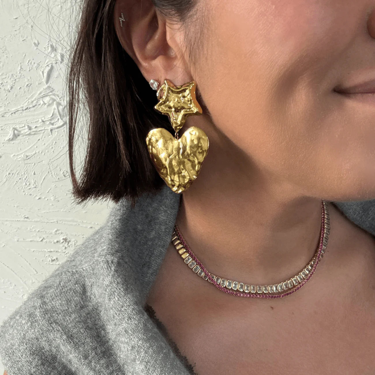 Add a playful sparkle to your look with these fun and iconic hammered star and heart earrings. Their imperfect charm brings a unique edge that instantly makes any outfit pop and stand out. Perfect for adding a touch of personality and shine wherever you go!