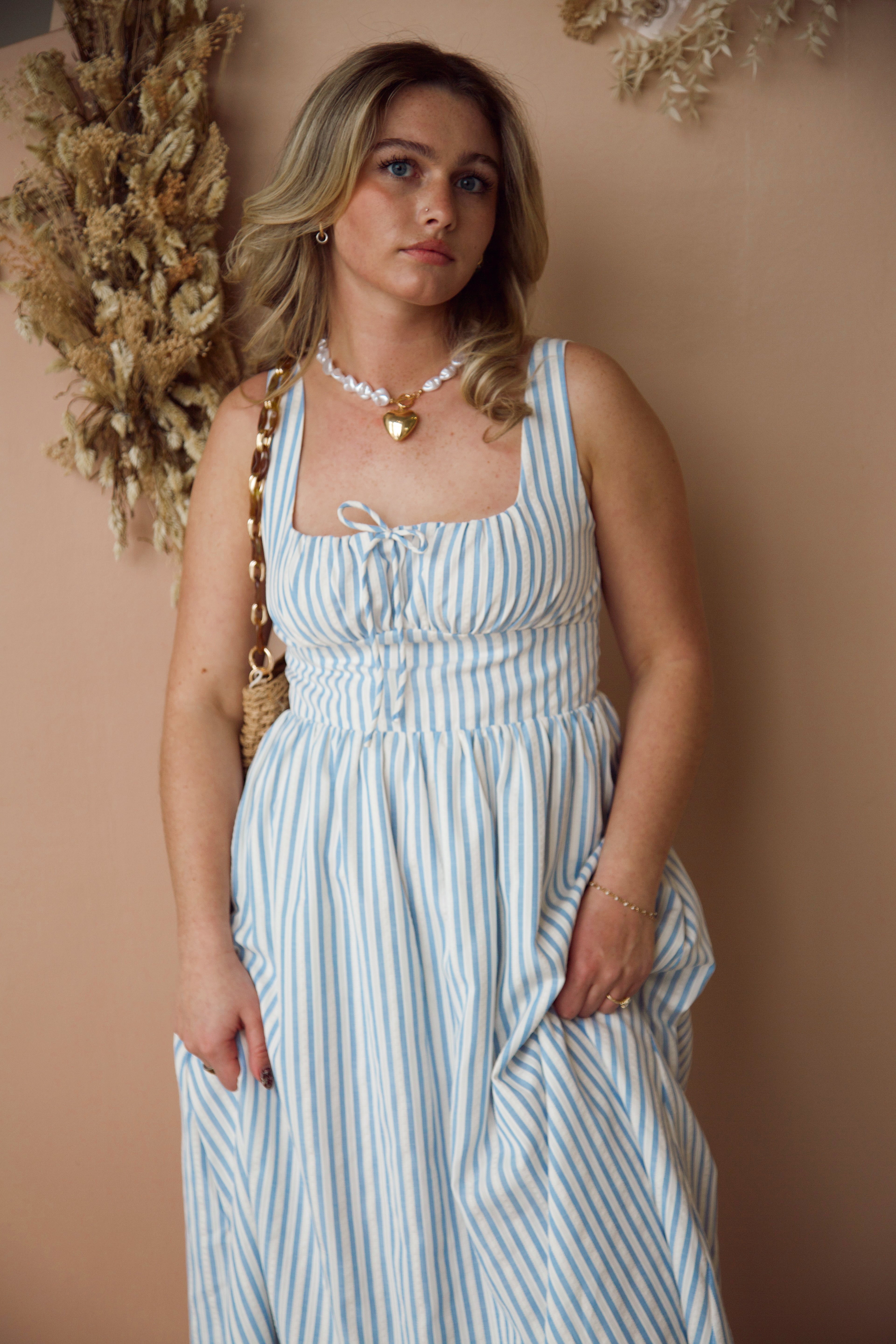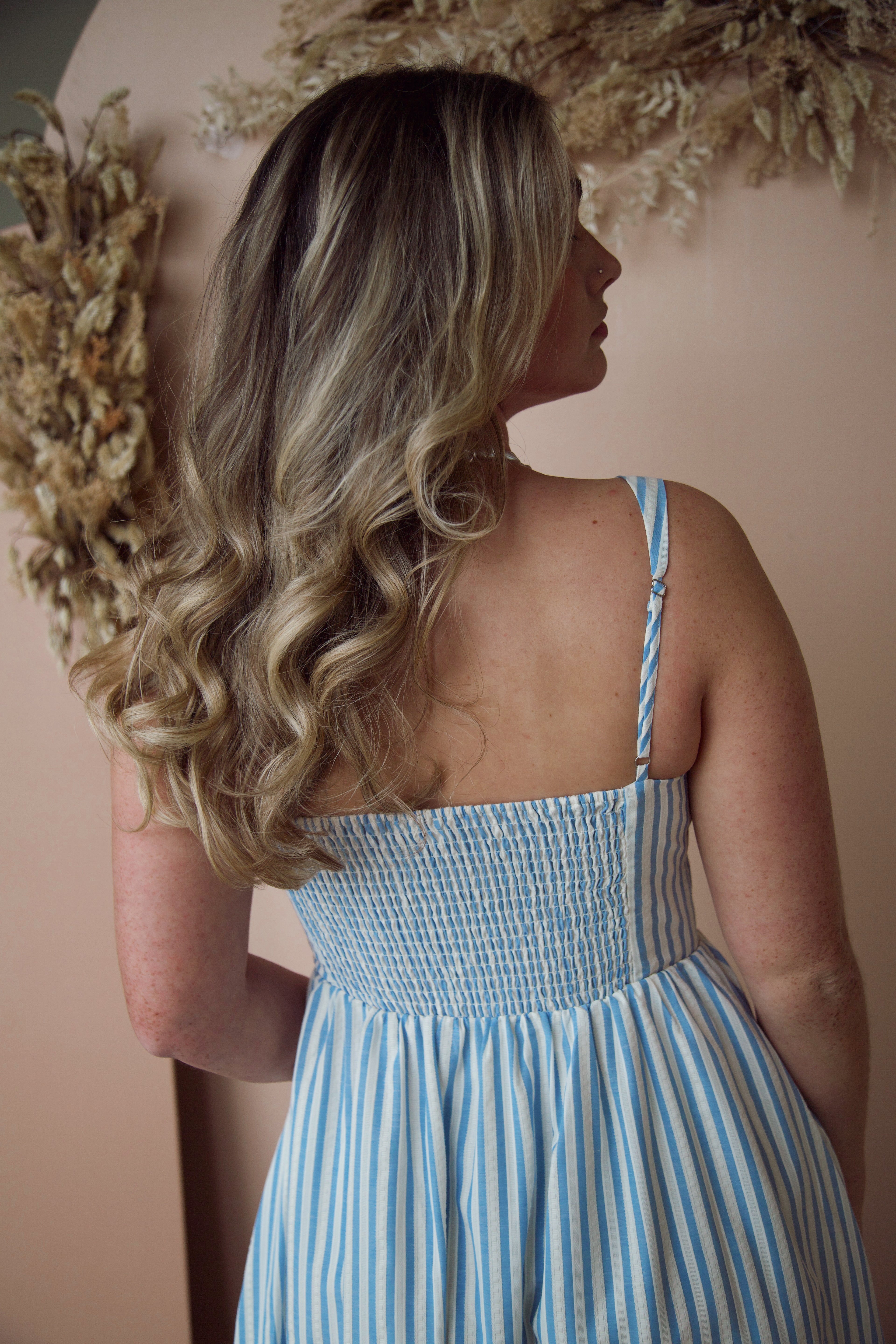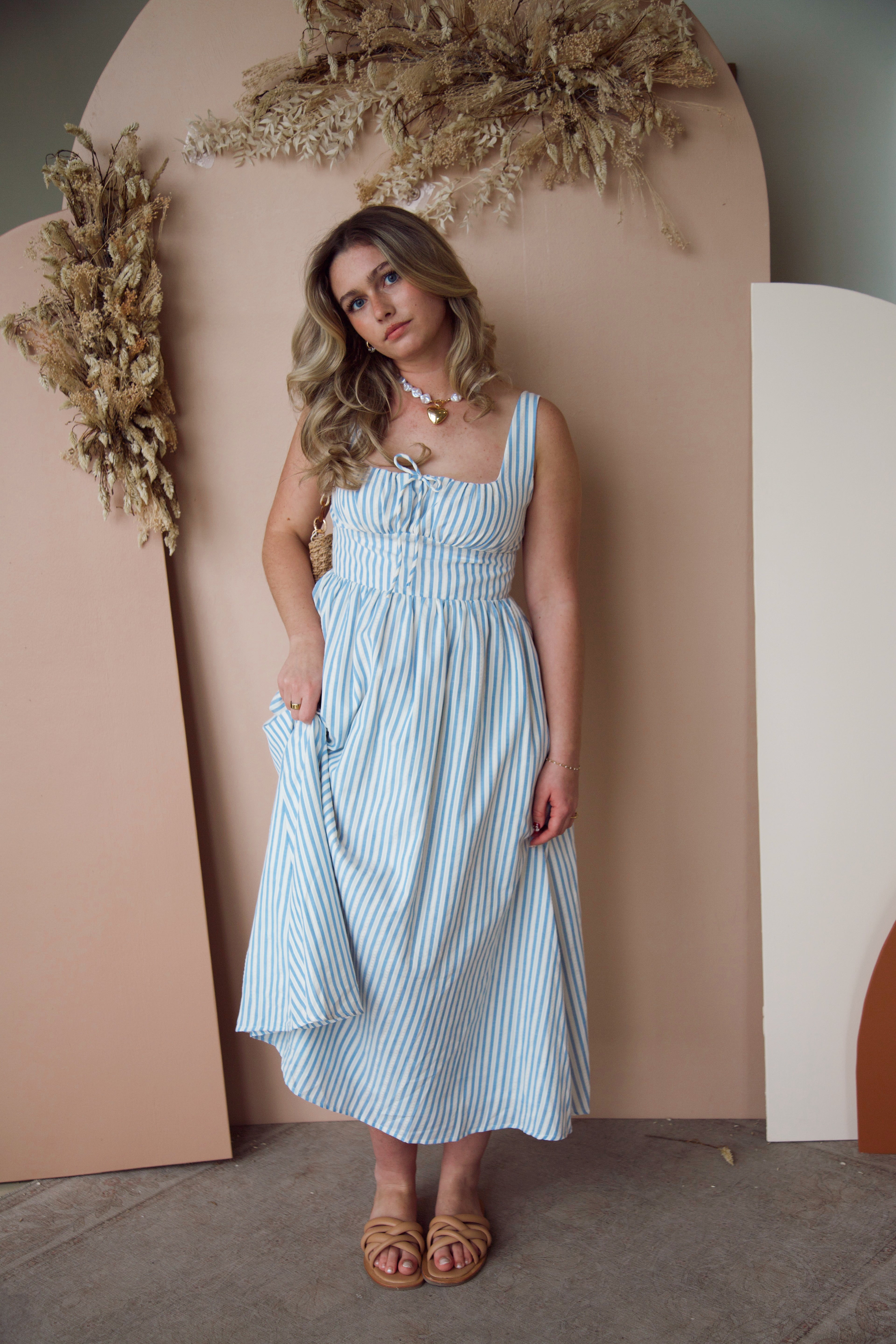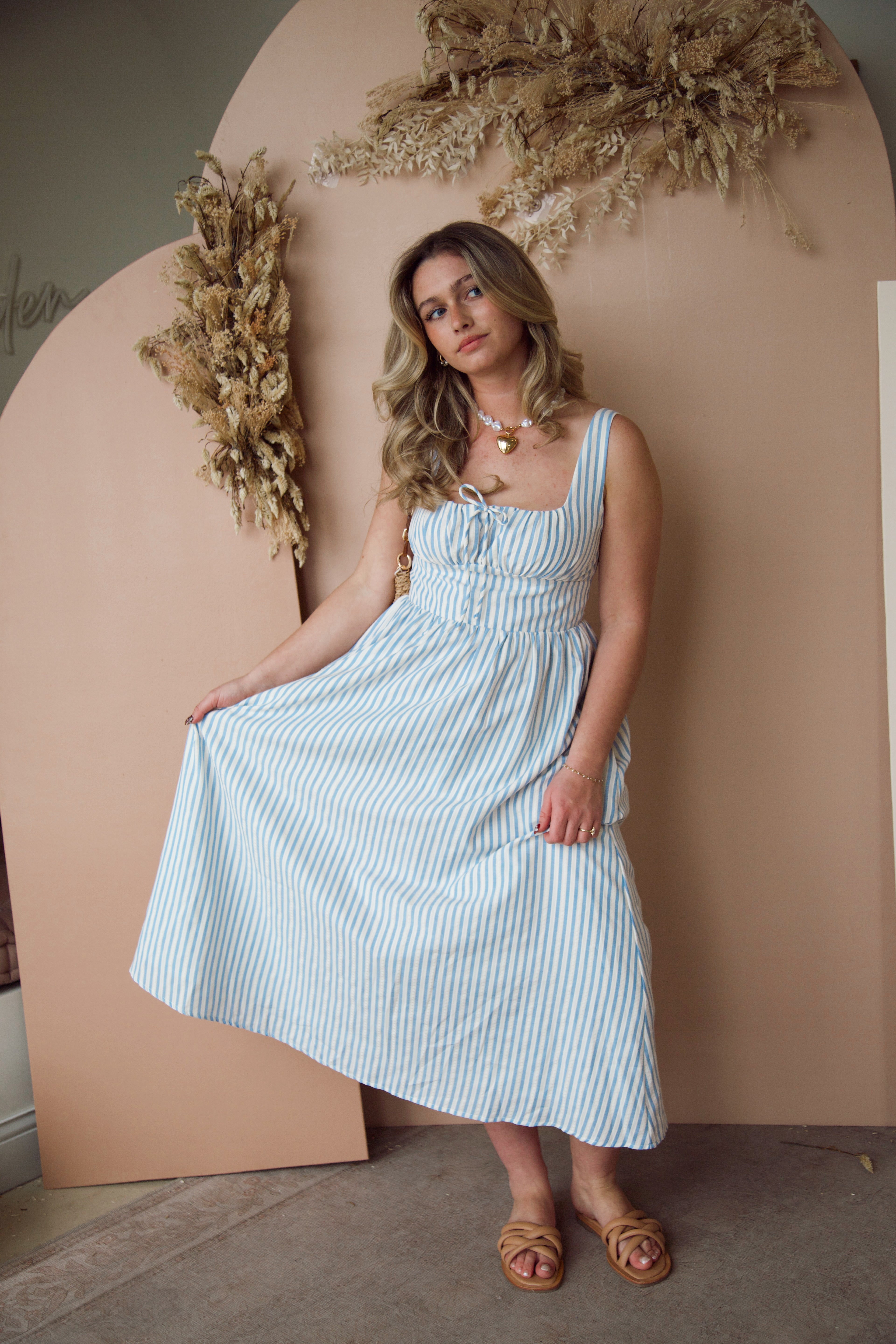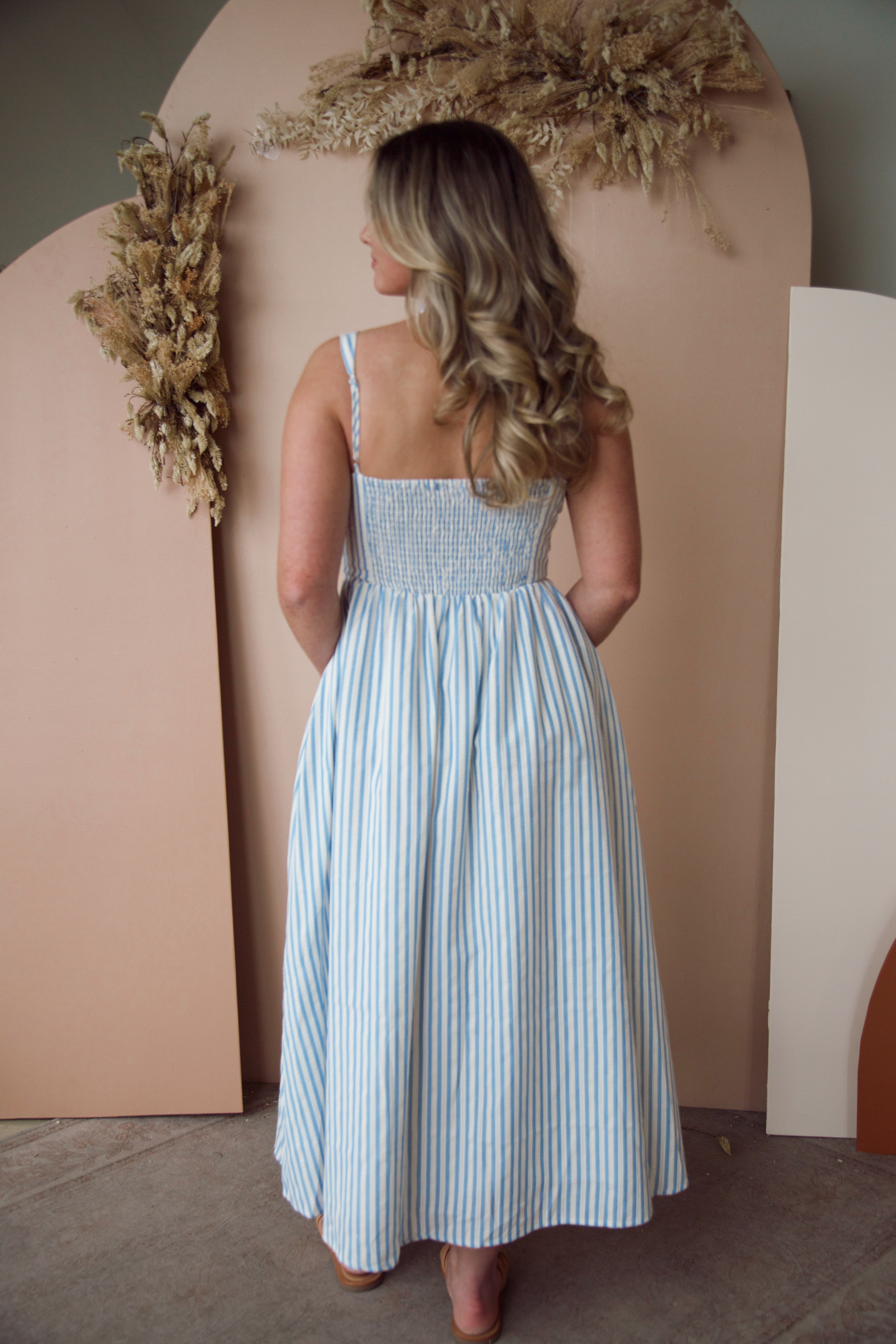 Step into spring with the Into the Night Striped Dress! This flattering fit hugs your curves in all the right places, while the trendy blue and white stripes bring a vibrant energy to your wardrobe. Embrace the season with style and confidence—this dress is a must-have!