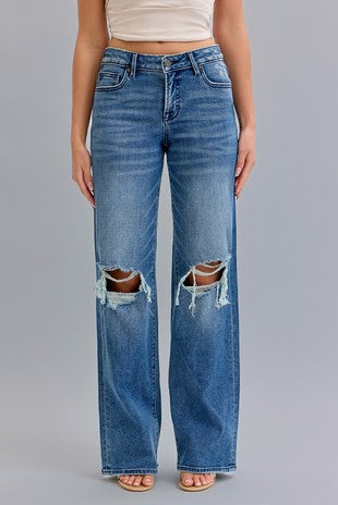 Dark Wash Mid Rise Distressed Dad Jean