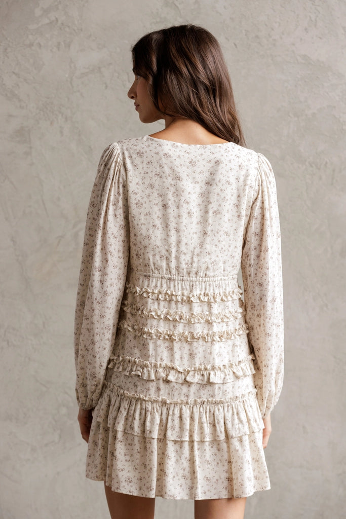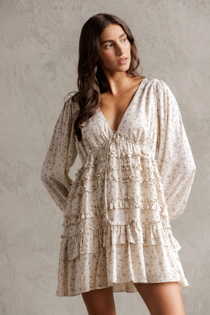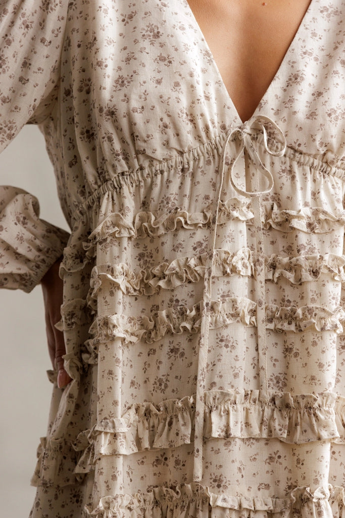 This playful My Girl Dress features a lightweight woven fabric adorned with a delicate ditsy floral print in soft ivory beige tones. Its tiered ruffle skirt adds lively movement, while the relaxed babydoll fit and V-neckline keep the look effortlessly charming. Long sleeves with gathered shoulders bring a touch of whimsy, and the adjustable tie at the bust ensures a perfect, comfy fit. Fully lined and easy to pull on, this dress blends breezy style with flattering comfort. Made from 90% viscose and 10% flax for a soft, breathable feel.