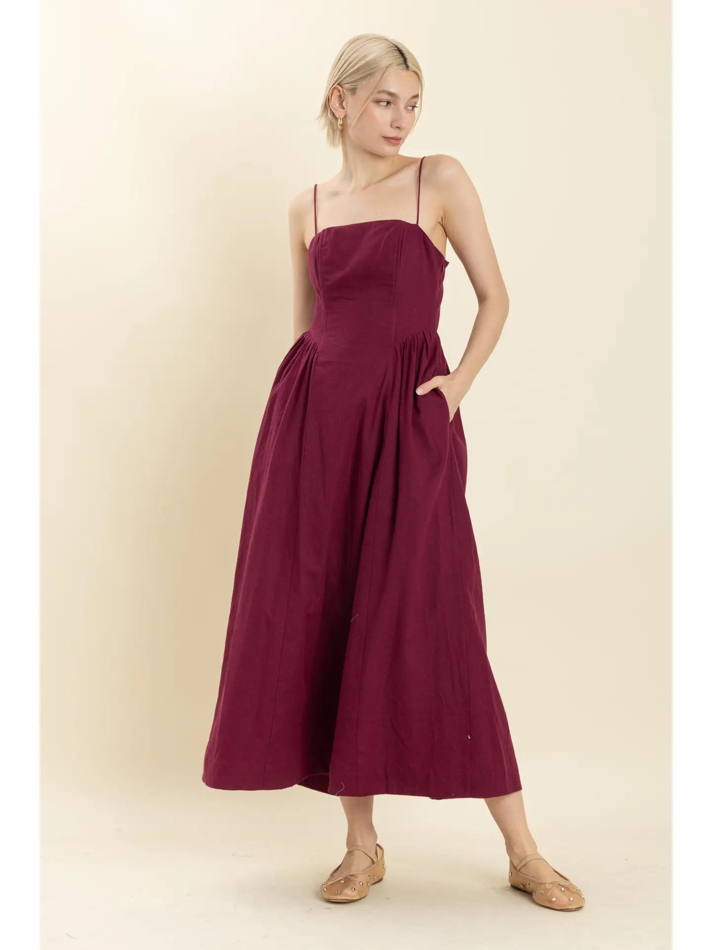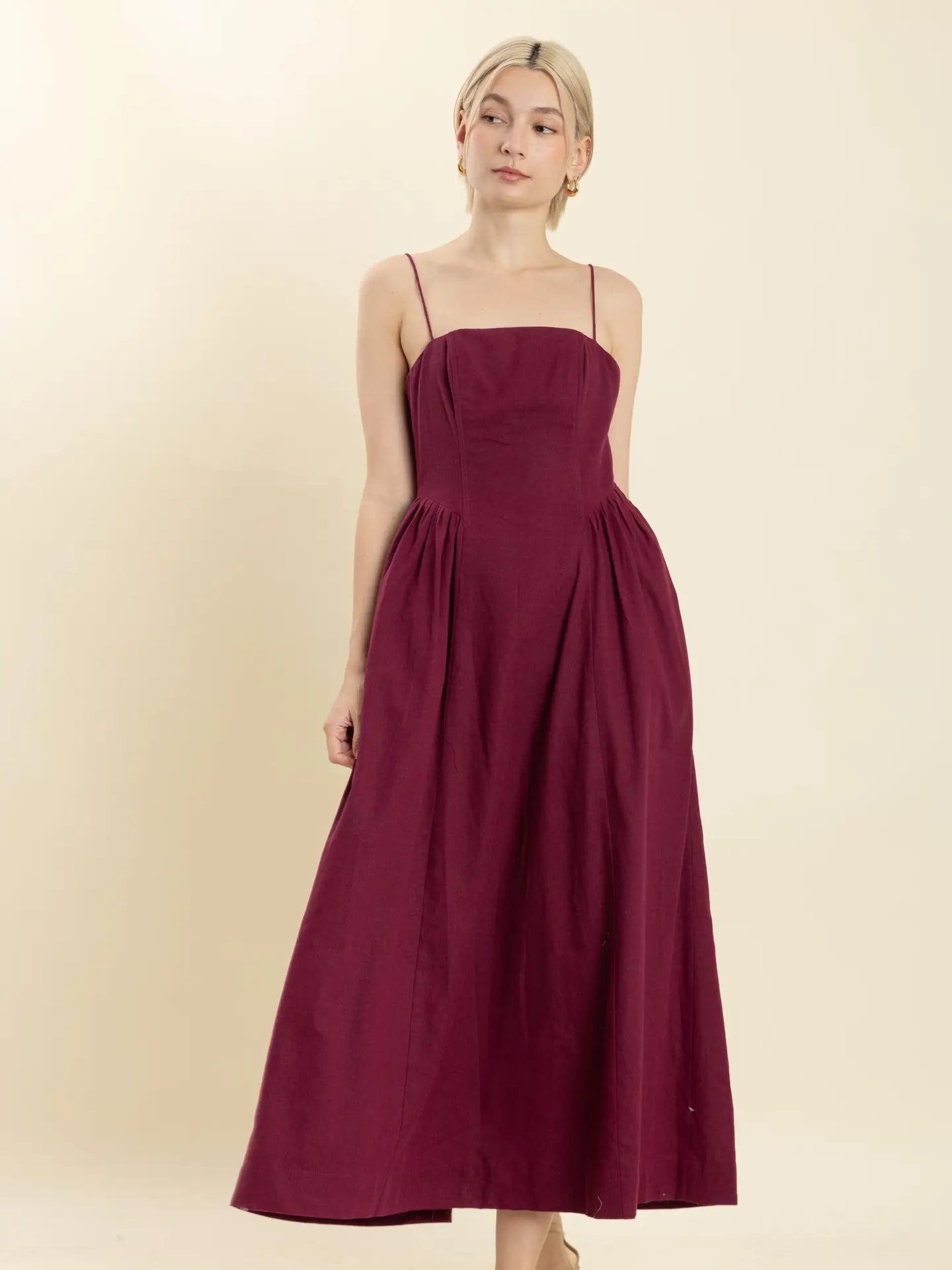 Slip into holiday glamour with The Cranberry Delight Midi Dress—a show-stopping piece that commands attention. Crafted from non-stretch linen weave, this dress features a structured corset-style bodice with boning for a flattering silhouette, paired with an elegant basque waist detail and subtle ruching. The convenient back zipper closure makes dressing effortless. Rich cranberry hue makes it perfect for festive celebrations, and it layers beautifully under a jacket or blazer for versatile styling. Pure elegance, pure joy.