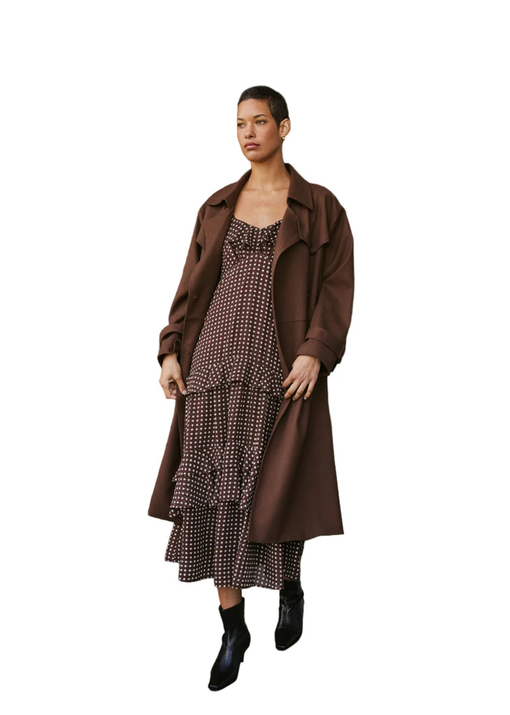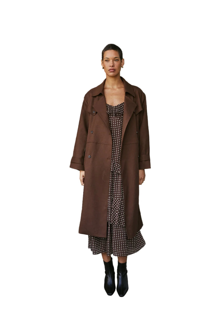 The Allen trench coat comes in a rich chocolate brown, making it the perfect outerwear choice for fall and winter. With its classic silhouette and luxurious feel, the Allen Trench Coat adds instant sophistication to any outfit. Layer it over your favorite sweaters, dresses, or knits for a polished look that stands out season after season. Elevate your wardrobe with this must-have statement piece.