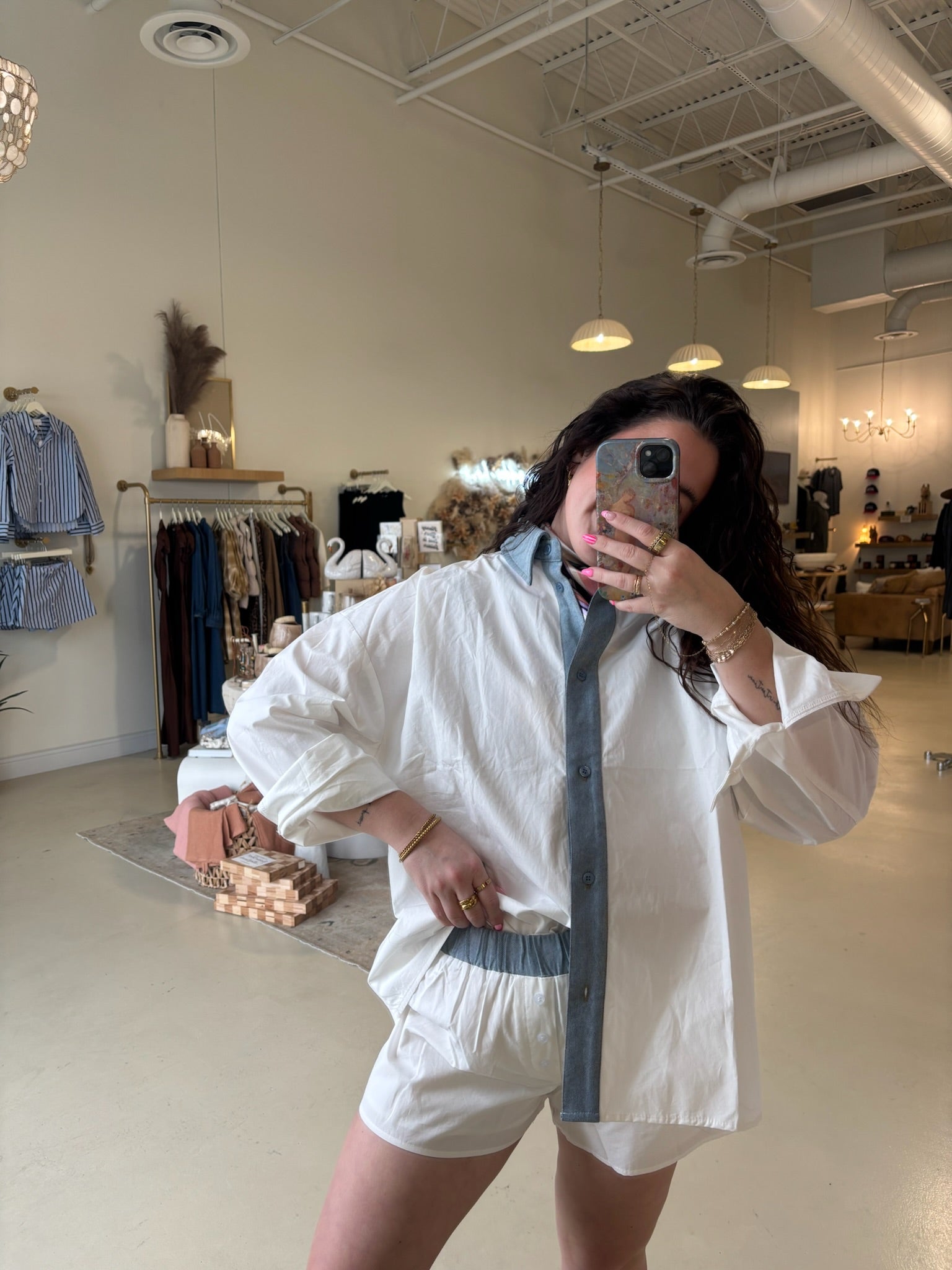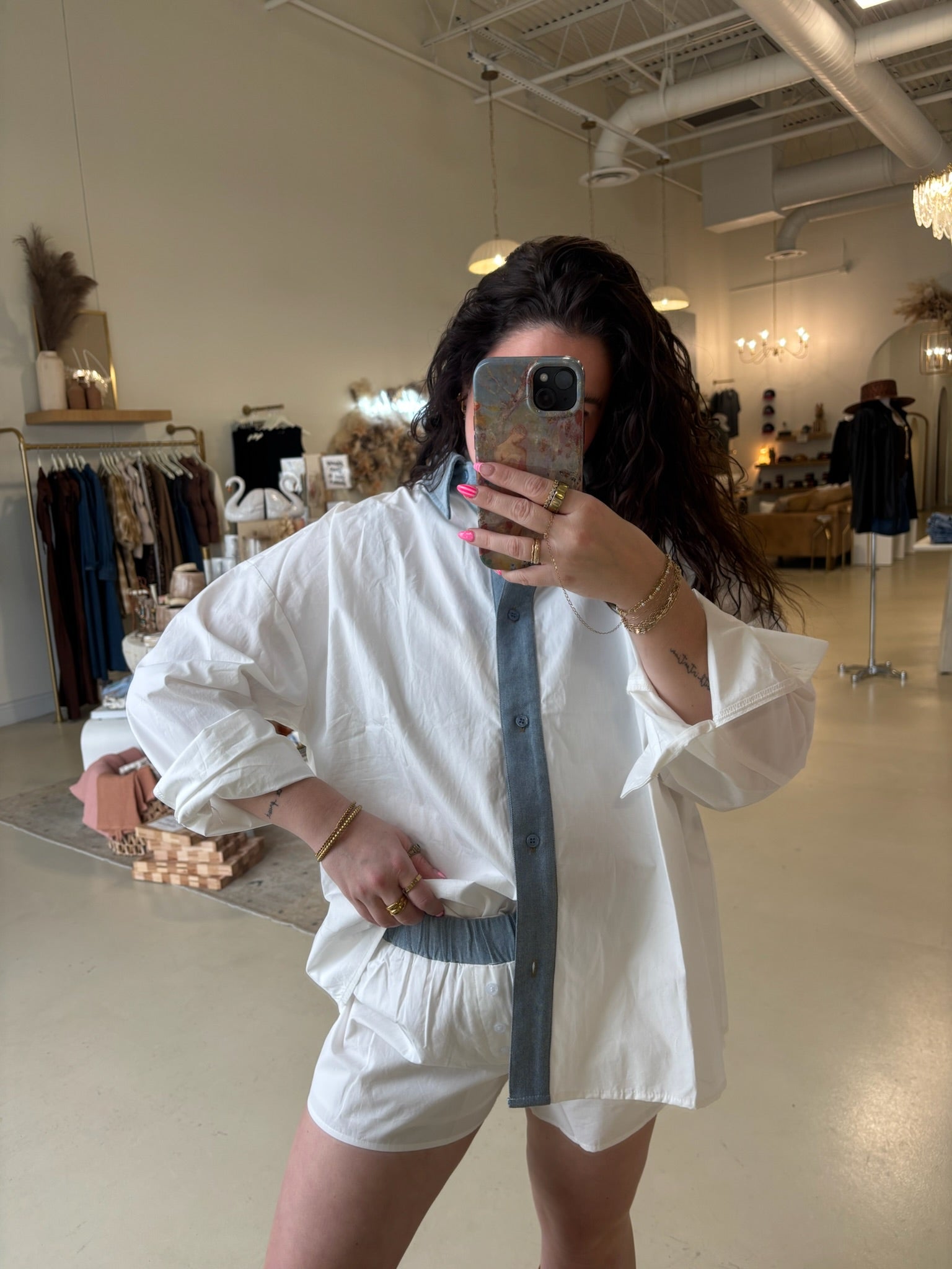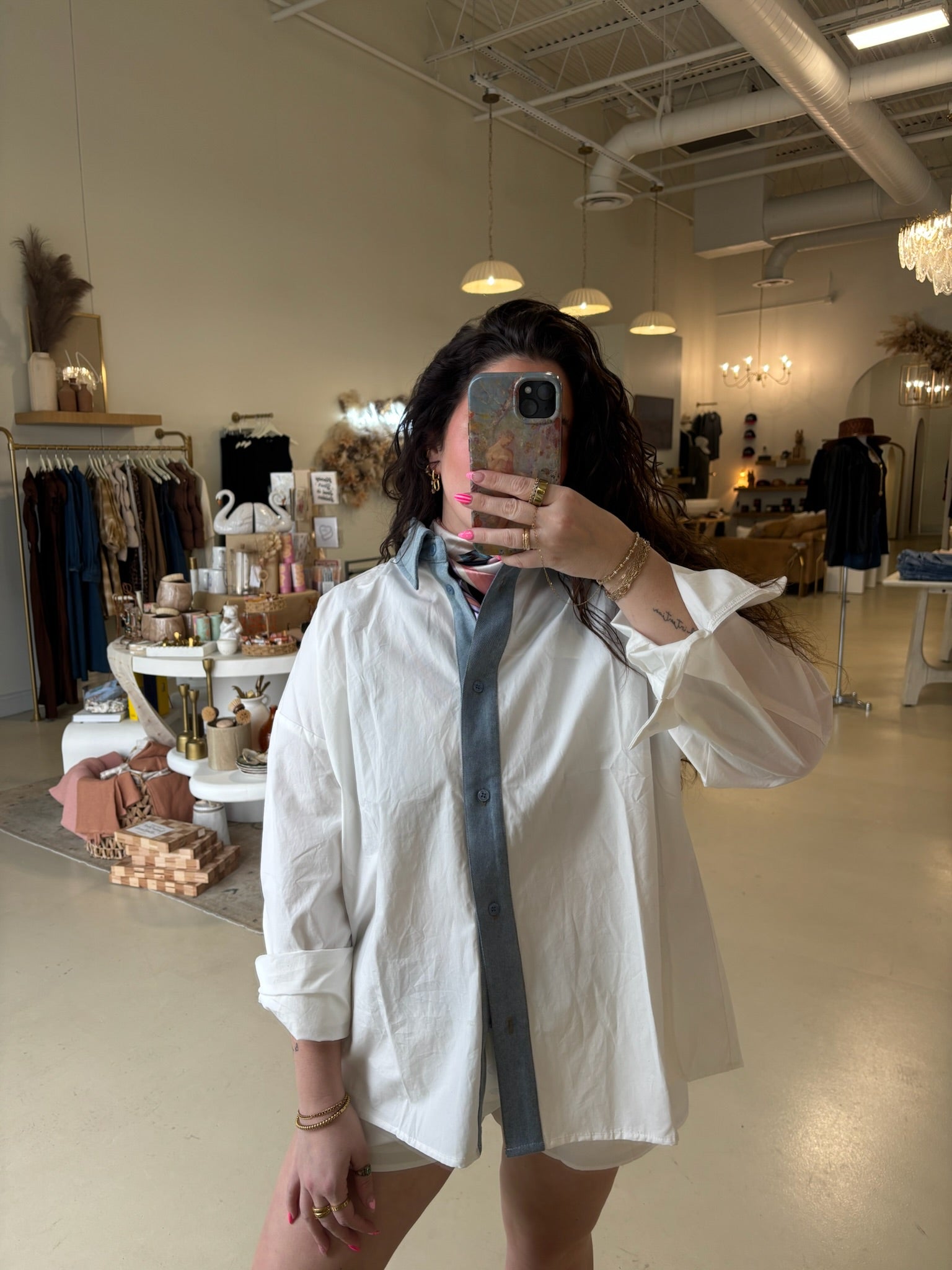 Breezy, effortless, and oh-so-chic—the Coastal Breeze Button-Up is your new wardrobe MVP. This crisp white shirt features eye-catching denim detailing that adds just the right amount of edge to your everyday look. Lightweight and perfectly tailored, it's designed for those who want to look put-together without feeling weighed down. Dress it up with tailored trousers or keep it casual with your favorite jeans. Pure coastal vibes, all day long.