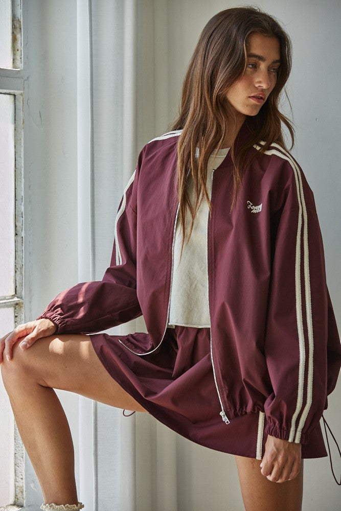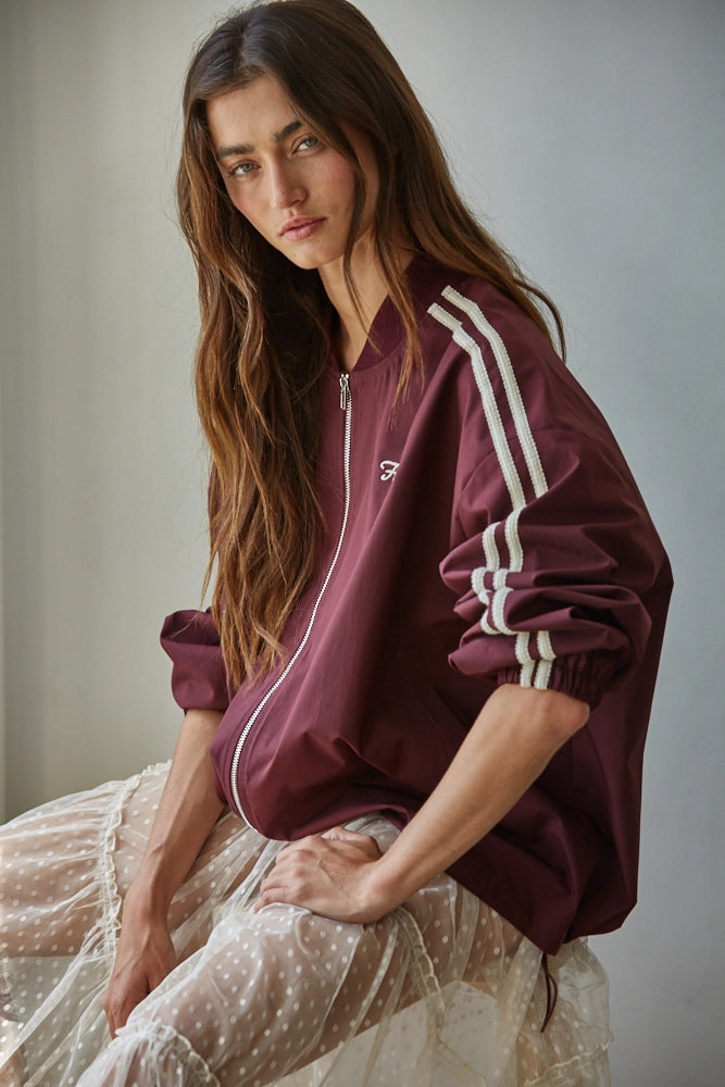 Step up your style game with the Forever More Bomber Jacket. This wine-colored, woven polyester jacket features a round neck, long sleeves, and a handy zipper closure. With practical pockets and trendy side tape trim, it’s as functional as it is fashionable. The embroidered "Forevermore" lettering adds a cool, confident vibe—perfect for girls who love to stand out. Whether you’re out with friends or just feeling fabulous, this jacket brings effortless attitude to any look.