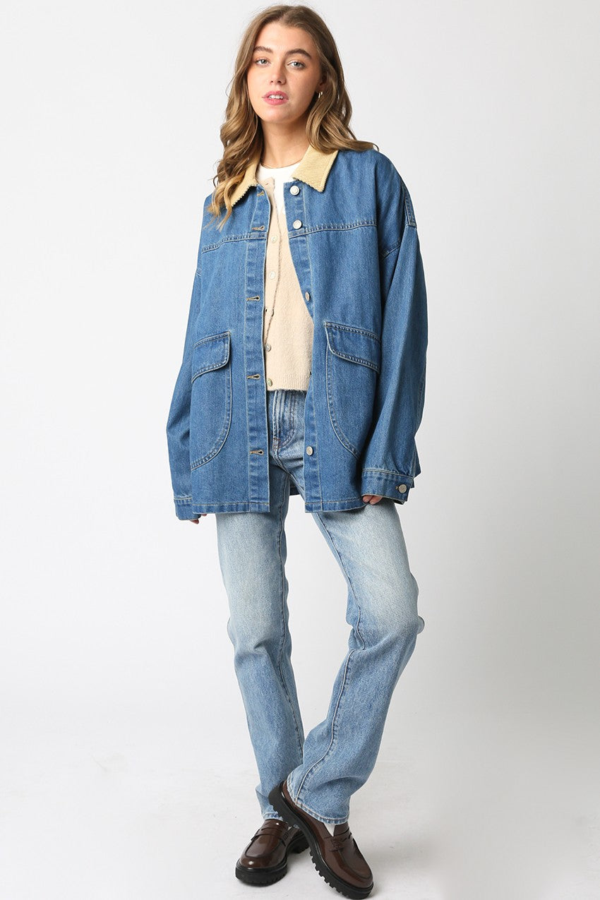 The Janelle Denim Jacket is your new go-to layer for effortless cool. Crafted with a relaxed oversized silhouette that feels like a warm hug, this jacket pairs classic denim with a charming corduroy collar for unexpected texture and style. Practical front pockets keep your essentials close while you're out and about. Perfect for throwing over anything in your wardrobe—dress it up or down and own every moment.
