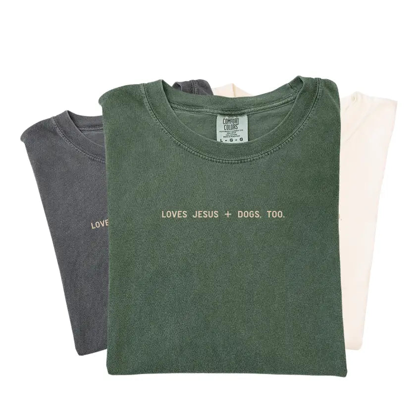 In a world that can feel heavy, sometimes joy looks like a wagging tail and unwavering faith. Our Loves Jesus + Dogs, Too tee is for the ones who pray hard, love deep, and never skip a morning walk.