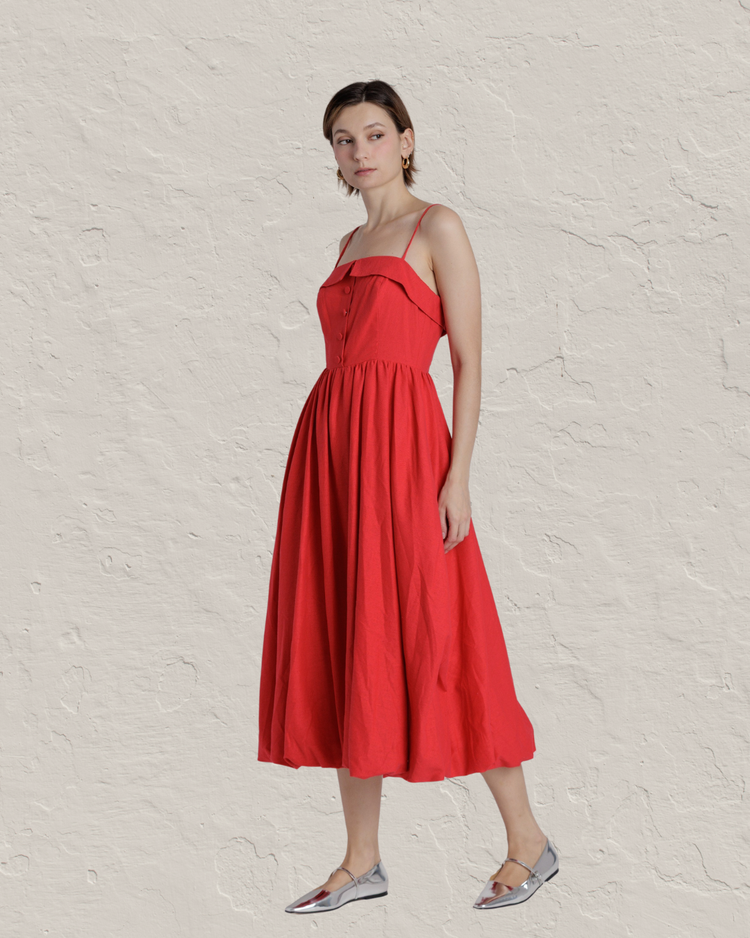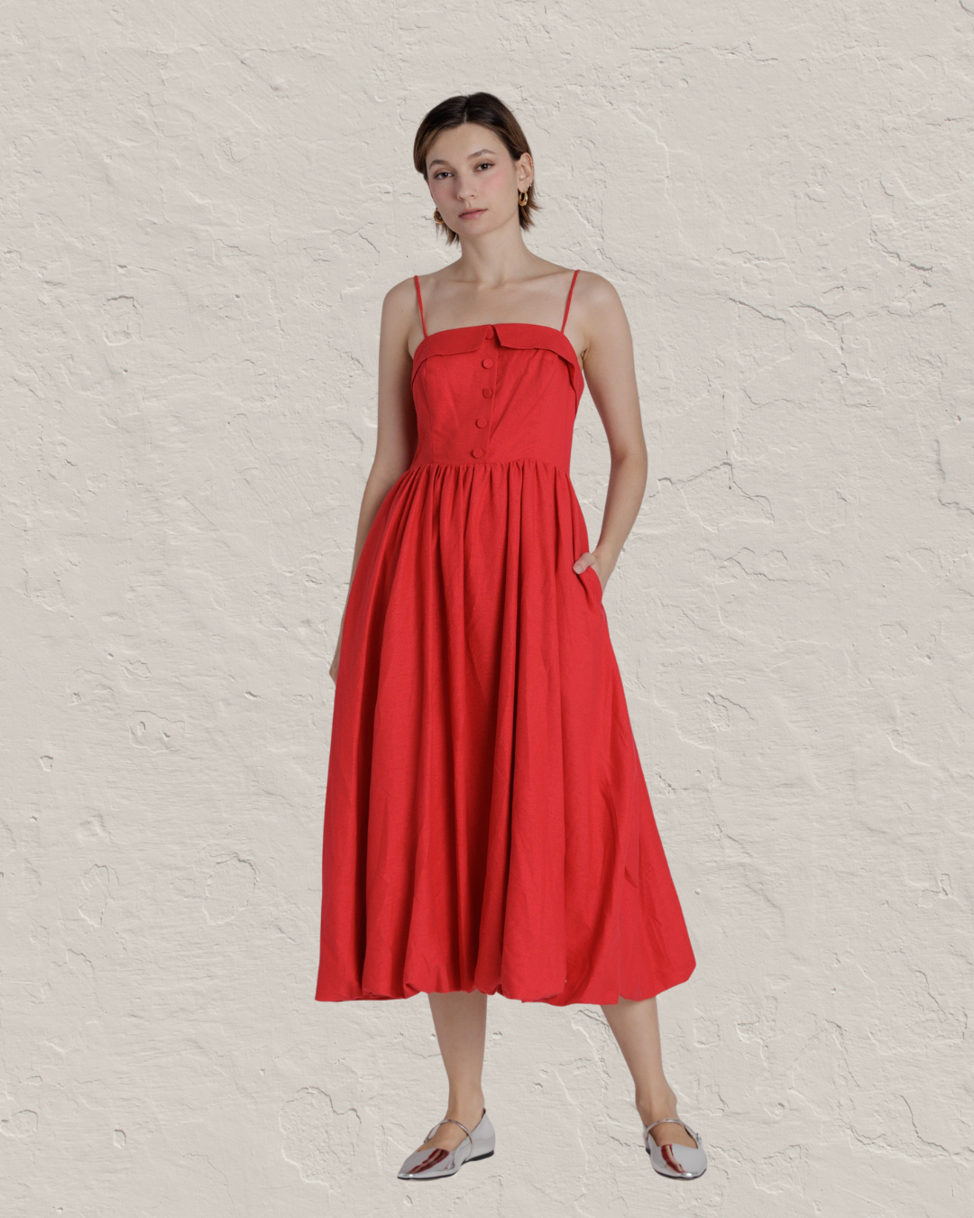 Elevate your spring and summer wardrobe with this stunning red bubble hem midi dress. The flattering silhouette and vibrant hue make it an ideal choice for graduation ceremonies, bridal showers, garden parties, and any special occasion. The playful bubble hem adds movement and charm, while the midi length offers timeless elegance. Whether you're celebrating a milestone or attending an upscale event, this dress delivers sophistication and style in one beautiful piece.