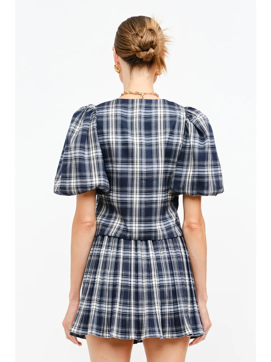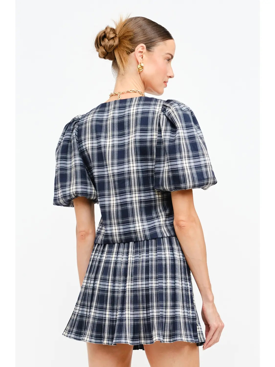 Elevate your holiday wardrobe with Piper's Plaid Top—a charming navy plaid vest featuring adorable puffed sleeves and adjustable front ties for the perfect fit. This festive piece brings instant charm to any outfit and pairs beautifully with our matching skirt for a coordinated, head-to-toe look that's sure to turn heads at your favorite seasonal celebrations.