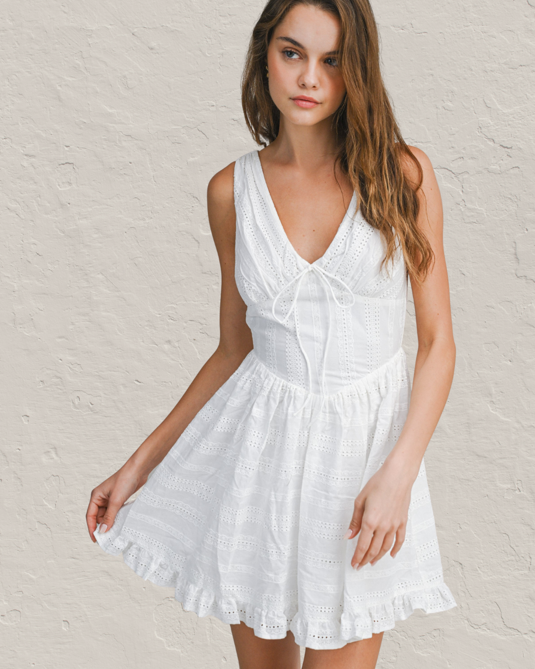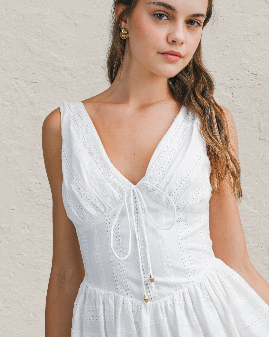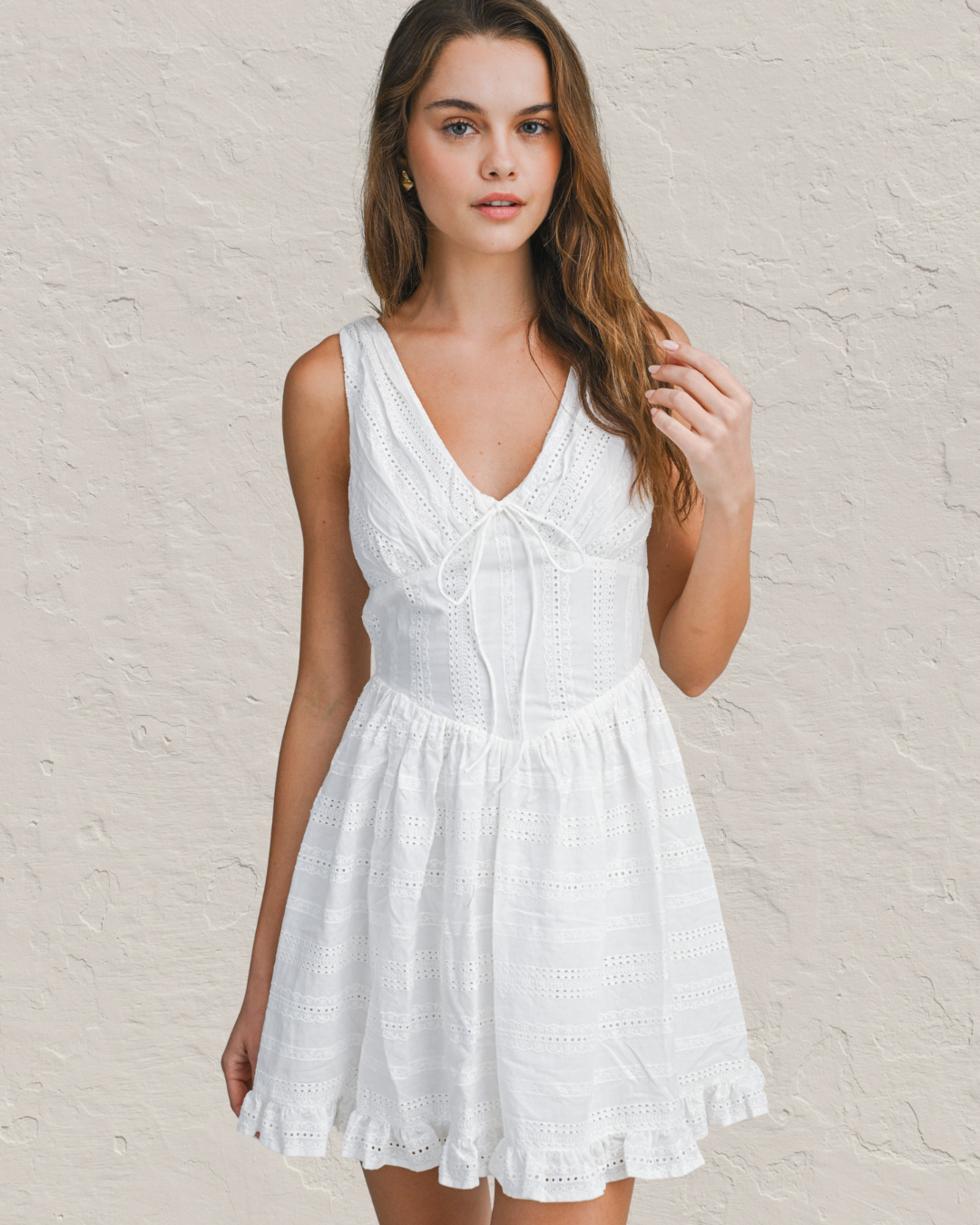 Graduation & Bridal Approved. Embrace effortless elegance with this charming white eyelet mini dress. Featuring a flattering V-neckline and smocked back panel, it offers both style and comfort. The tiered A-line silhouette creates graceful movement, while delicate lace trim adds a romantic touch. Crafted from lightweight, breathable fabric, this versatile piece transitions seamlessly from summer vacations to weekend brunches. A wardrobe essential for those who love feminine, timeless design.