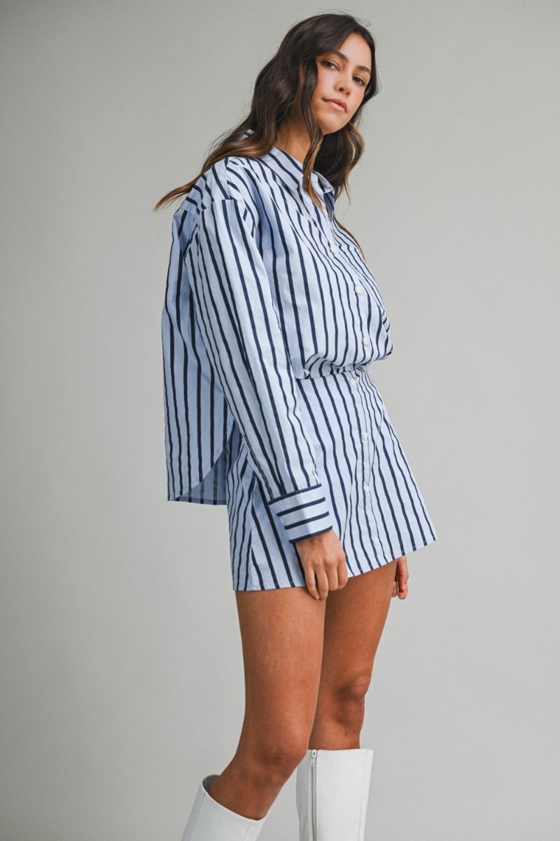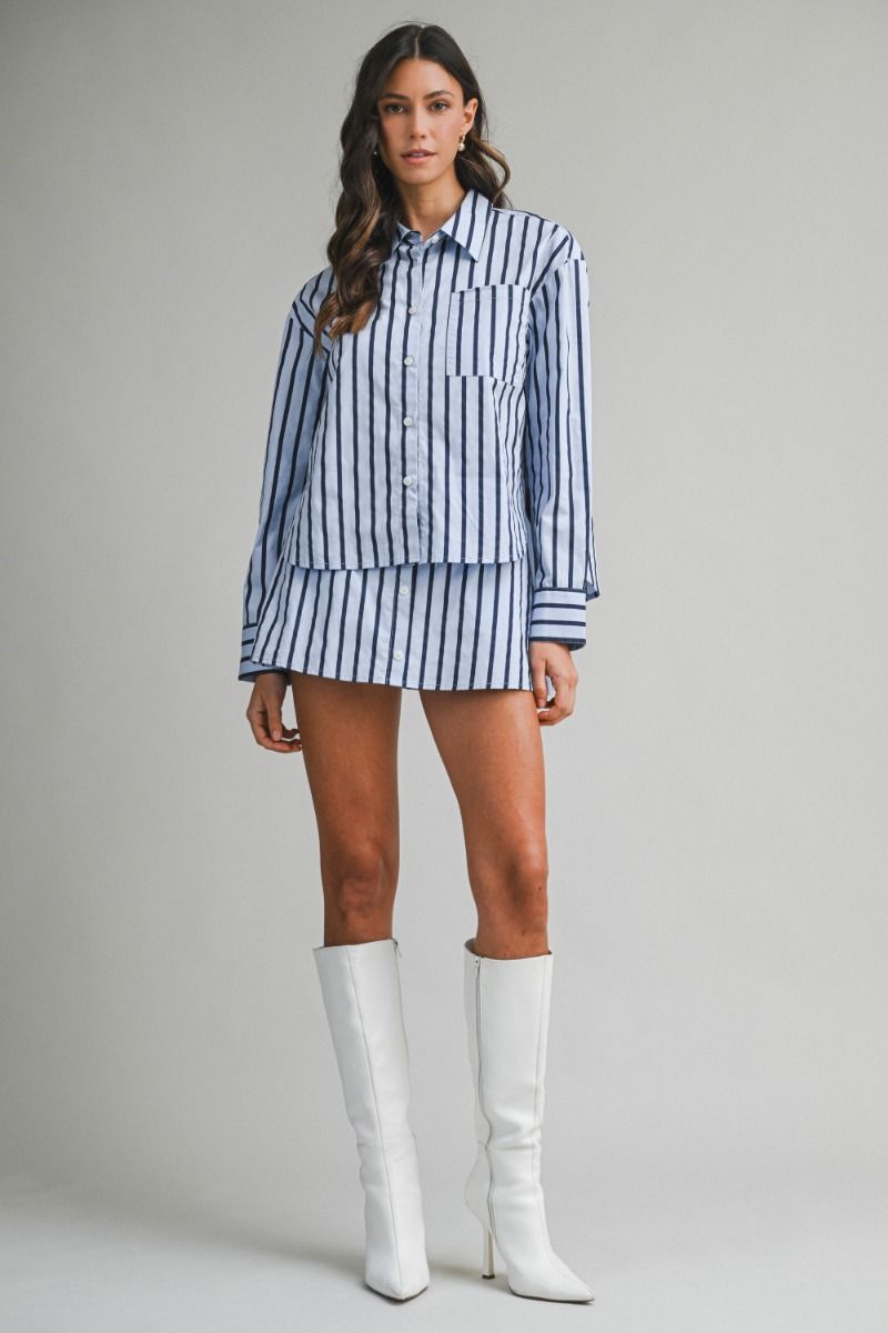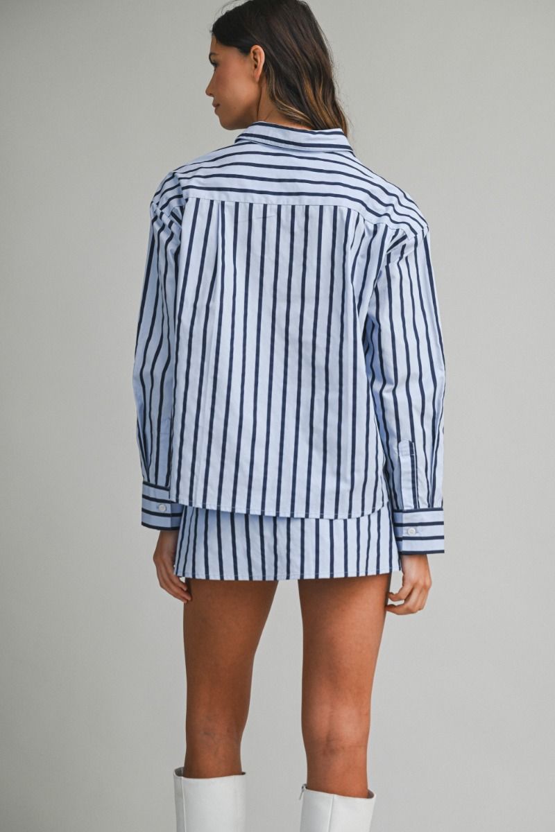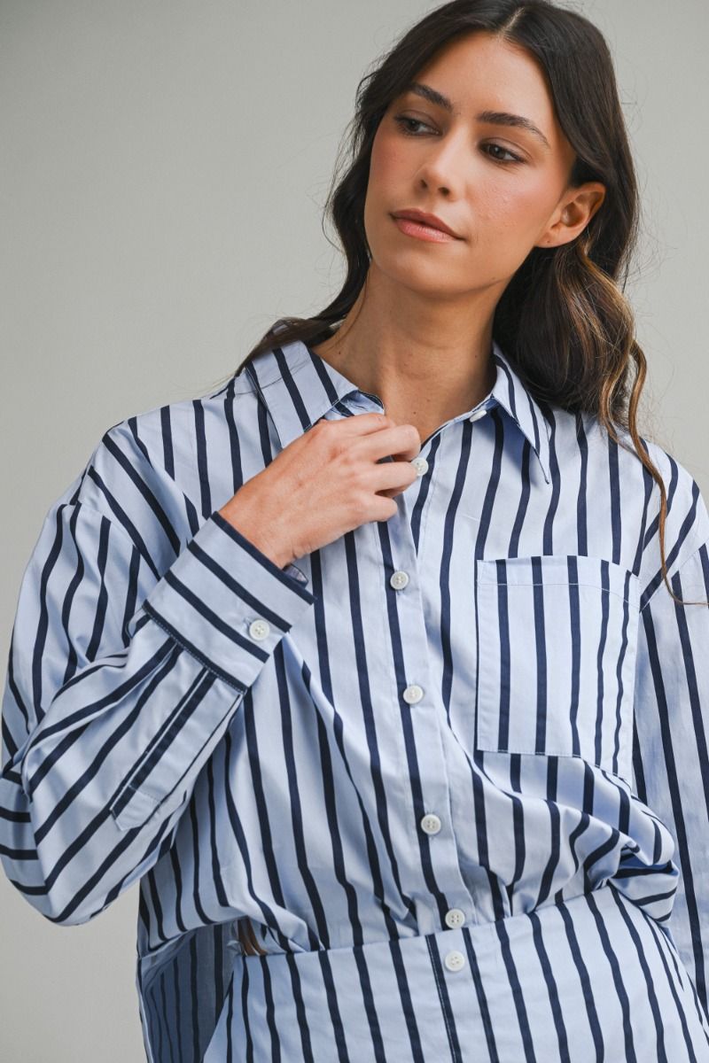 Jet-set ready in our crisp pin-striped button-up! This timeless travel essential features a classic navy and lighter blue stripe pattern that pairs with everything in your carry-on. Crafted from 100% cotton, it's breathable enough for layering or wearing solo, and structured enough to look polished whether you're catching flights or catching up with friends. The long sleeves and button-down front make it endlessly versatile—dress it up or down, pack it anywhere, and always look put-together.