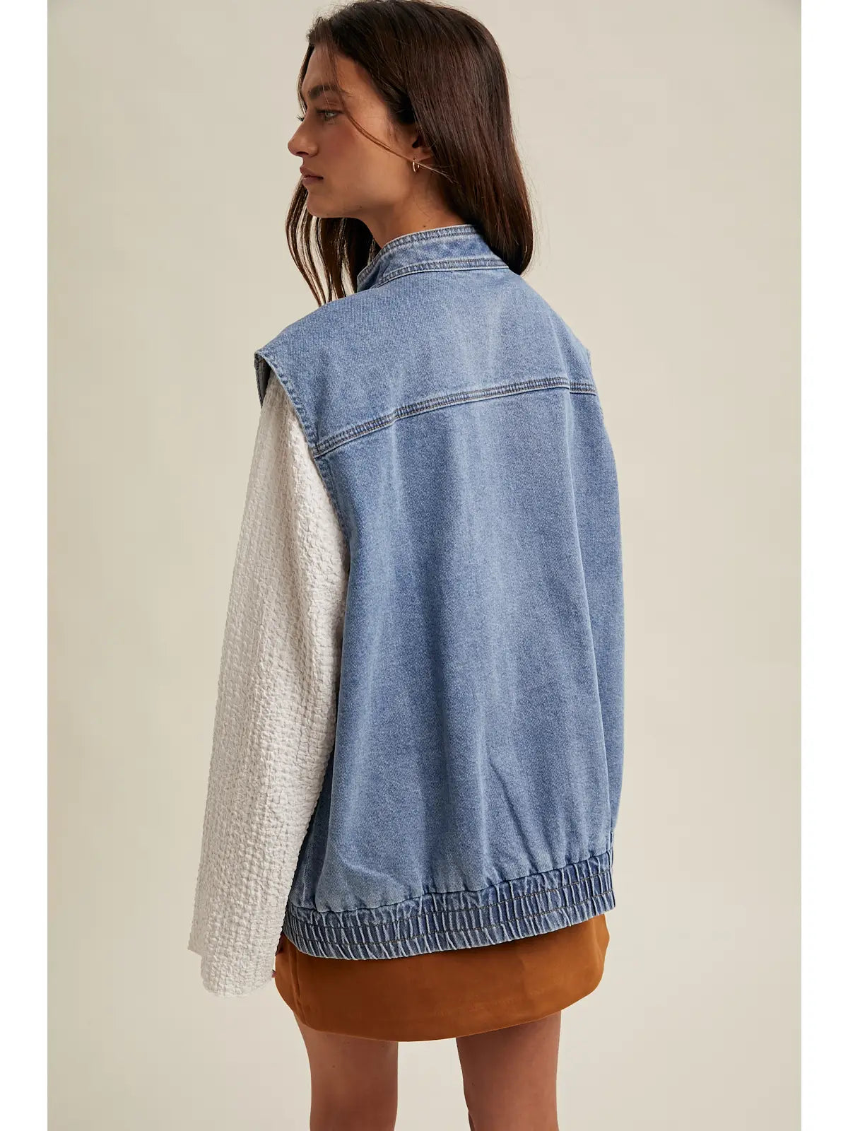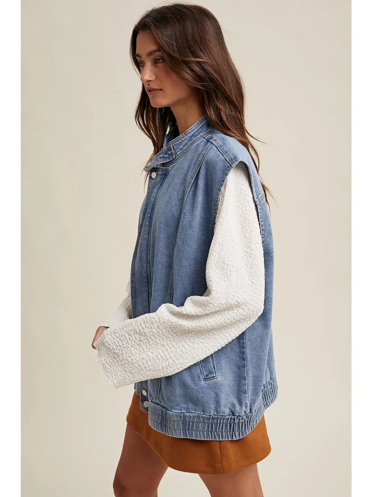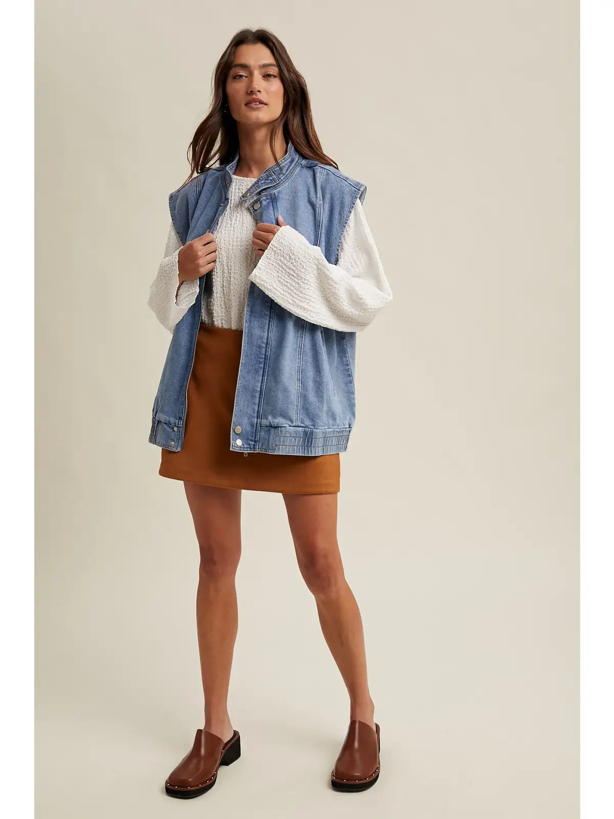 Elevate your look with our Denim High-Neck Vest. This stylish piece offers a modern silhouette with a chic high neckline, perfect for layering or making a statement on its own.