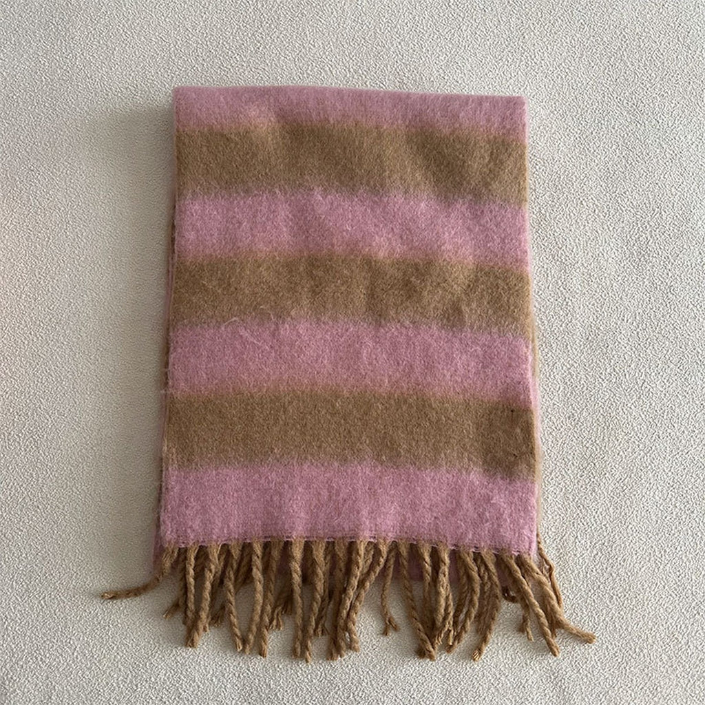 Wrap yourself in cozy charm with The Frosty Striped Scarf in Strawberry Icing. Crafted from a soft blend of 50% acrylic and 50% polyester, it offers both warmth and playful style. The sweet striped pattern adds a cheerful pop to any outfit, perfect for chilly days when you want to stay snug and colorful.