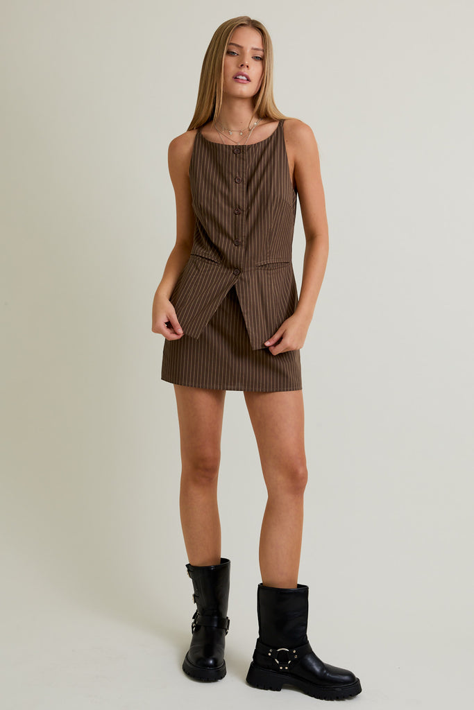 The Maggie Skort features charming brown-beige stripes and a playful mini skirt silhouette with built-in shorts for comfort and ease. Its short, flirty design makes it perfect for pairing with a variety of tops and shoes, giving you endless stylish outfit options for any occasion.