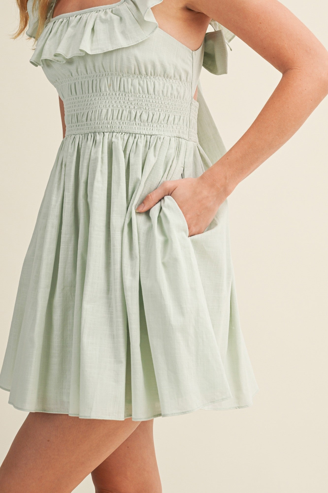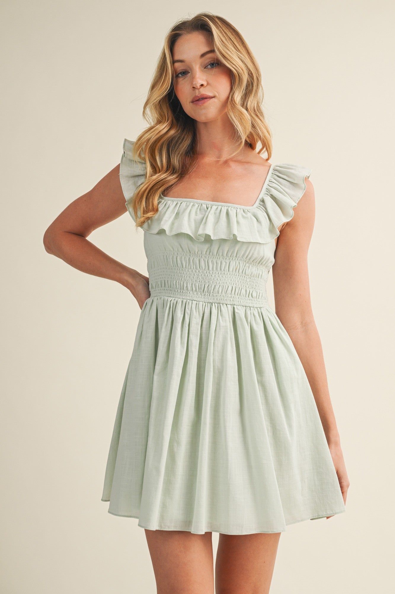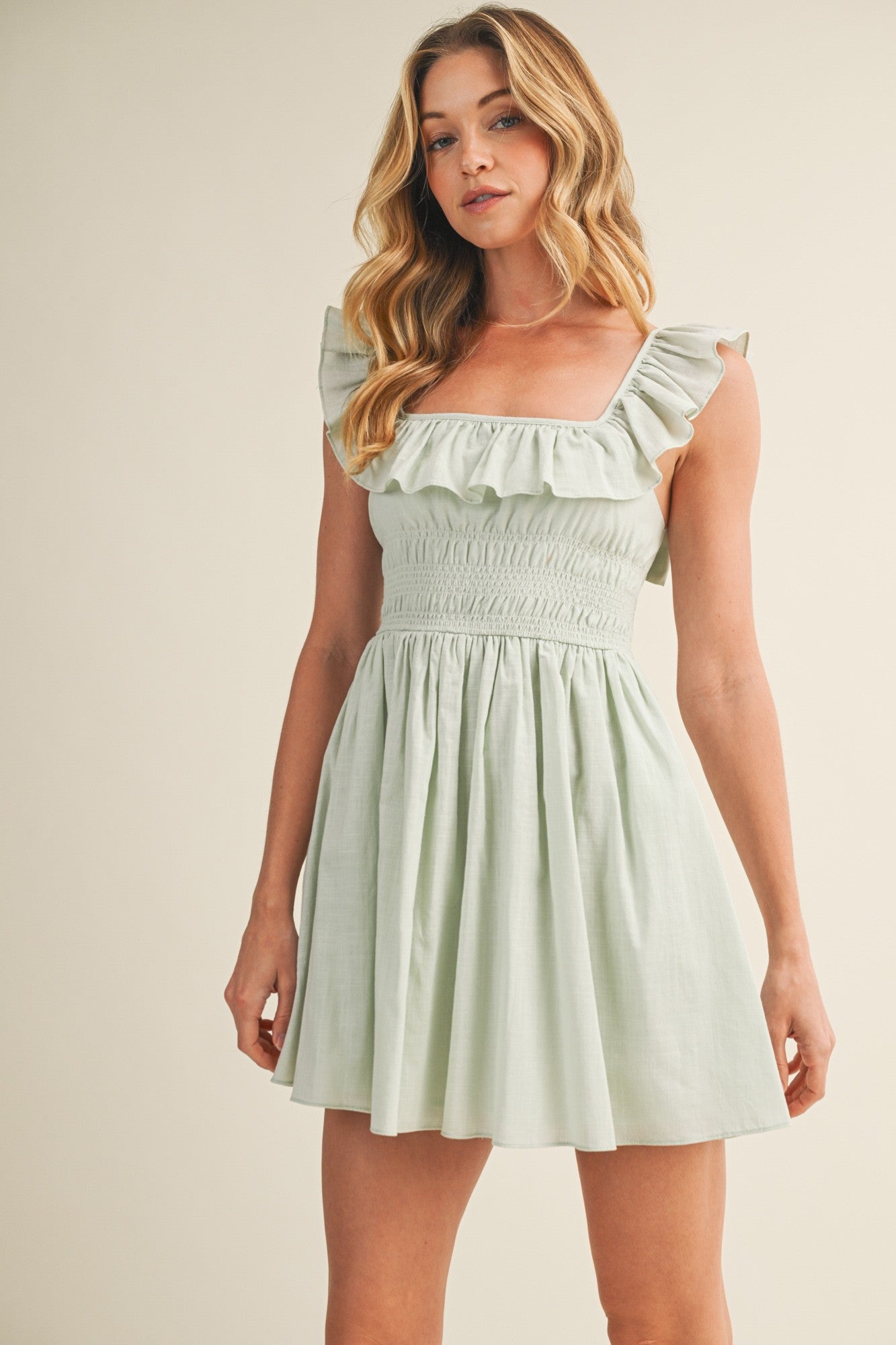 The Maybell Dress is your go-to pick for effortless spring style! This adorable short dress features charming ruffles and a fresh mint hue that's perfect for warm-weather adventures. The playful ruffle details add movement and personality, while the breezy cut keeps you cool and comfortable. Whether you're heading to brunch, a casual outing, or a garden party, this springy number brings instant charm to any occasion. Dress it up with sandals or keep it casual—either way, you'll feel cute and confident!
