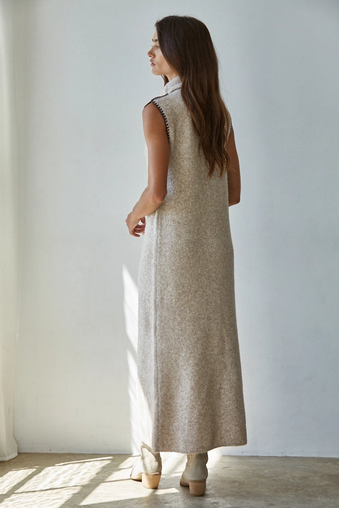 The Reggie Sweater Bodycon Dress blends cozy knit with a sleek, sleeveless silhouette for a playful, cool look. Its turtleneck and stitch details add charm, while the maxi length keeps it effortlessly chic. Perfect for layering or wearing solo, this dress is simple yet stunning—ready to turn heads and keep you comfy all day long.