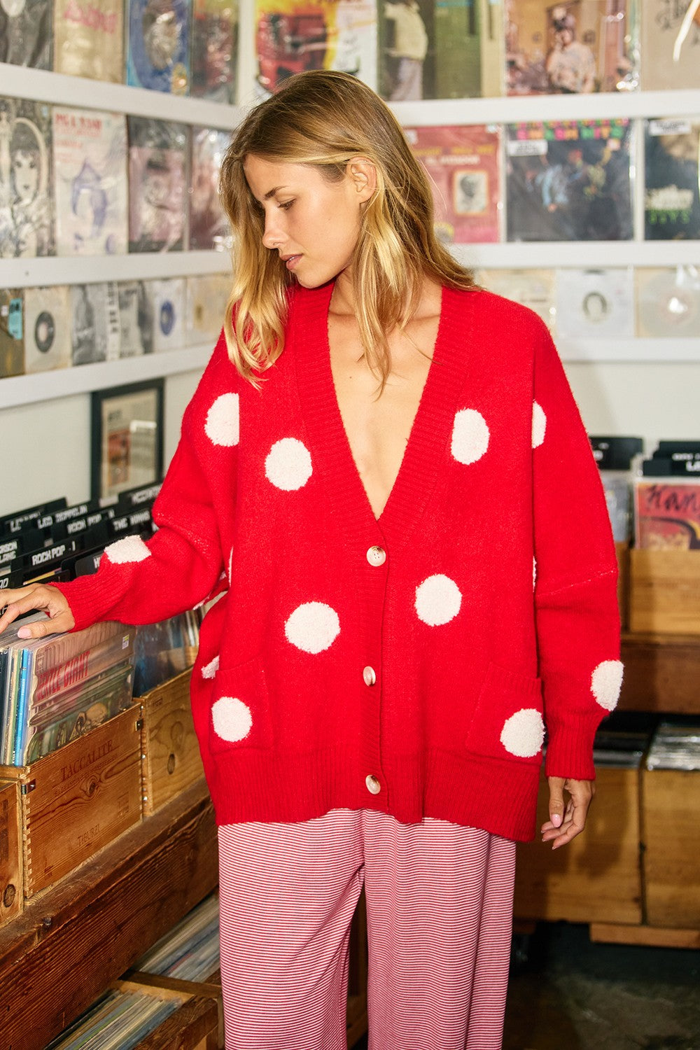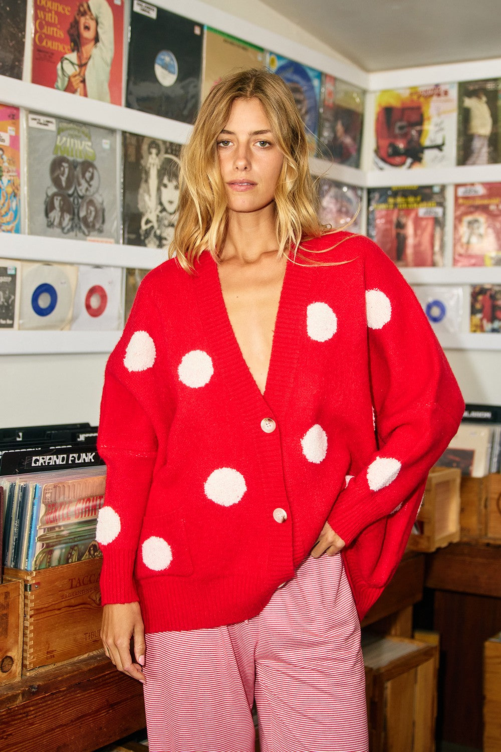 Make a statement with this charming oversized cardigan featuring a bold polka-dot pattern that demands attention. The relaxed drop-shoulder silhouette and open front button-down design offer effortless style, while the V-neckline adds a flattering touch. Practical side pockets keep your essentials close, making this fun piece perfect for layering over your favorite tees or dresses. Embrace the playful vibe and let your personality shine through.
